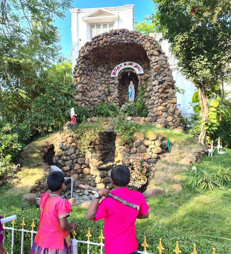 In Indien gibt es eine beachtliche Anzahl von Lourdesgrotten. In Chennai (Madras), der Hauptstadt des Bundesstaates Tamil Nadu, an der Ostküste des Subkontinents finden sich gleich zwei: eine neben der Kathedrale des Bistums, der Basilika St. Thomas im Stadtteil Mylapore. In der Krypta dieser Kirche wird bis heute die erste Grabstätte des Apostels Thomas verehrt. Dort durfte ich im Januar 2023 eine hl. Messe feiern.