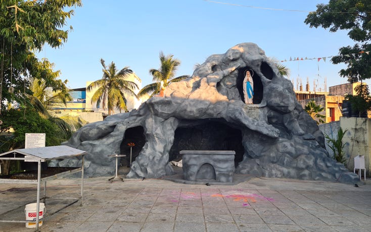In Indien gibt es eine beachtliche Anzahl von Lourdesgrotten. In Chennai (Madras), der Hauptstadt des Bundesstaates Tamil Nadu, an der Ostküste des Subkontinents finden sich gleich zwei: eine neben der Kathedrale des Bistums, der Basilika St. Thomas im Stadtteil Mylapore. In der Krypta dieser Kirche wird bis heute die erste Grabstätte des Apostels Thomas verehrt. Dort durfte ich im Januar 2023 eine hl. Messe feiern.